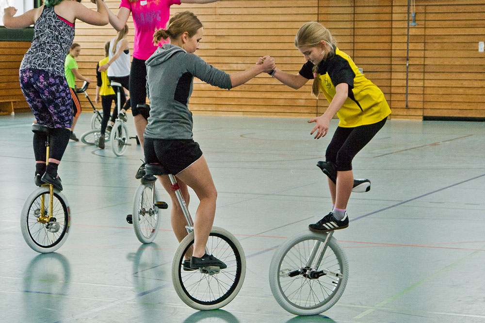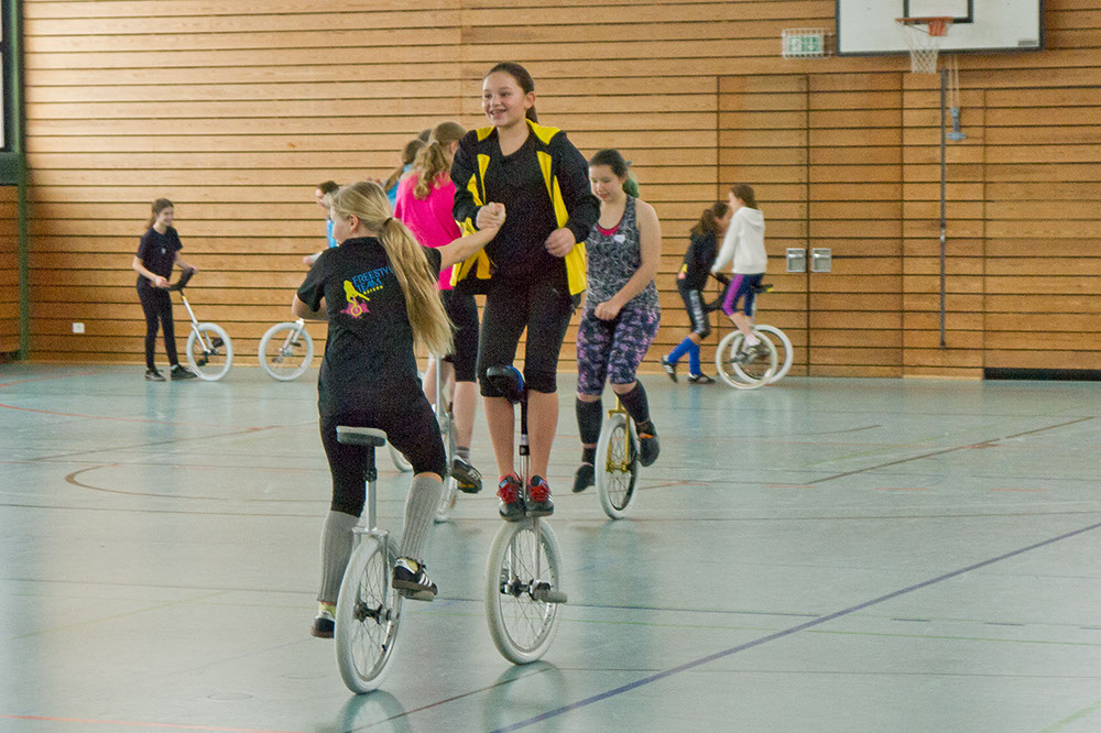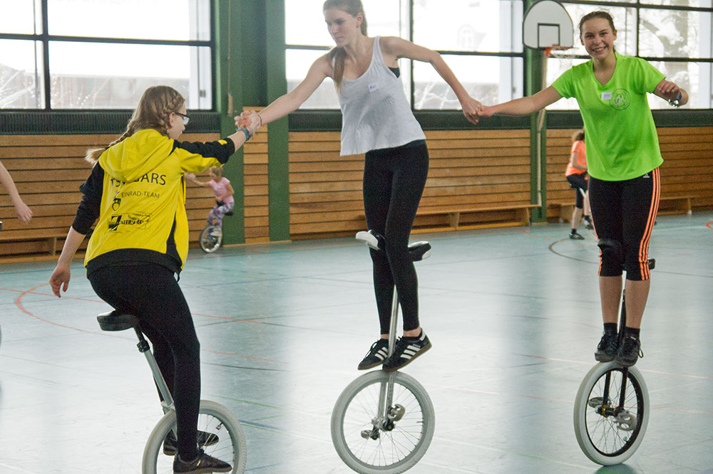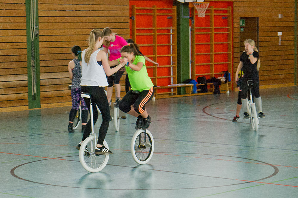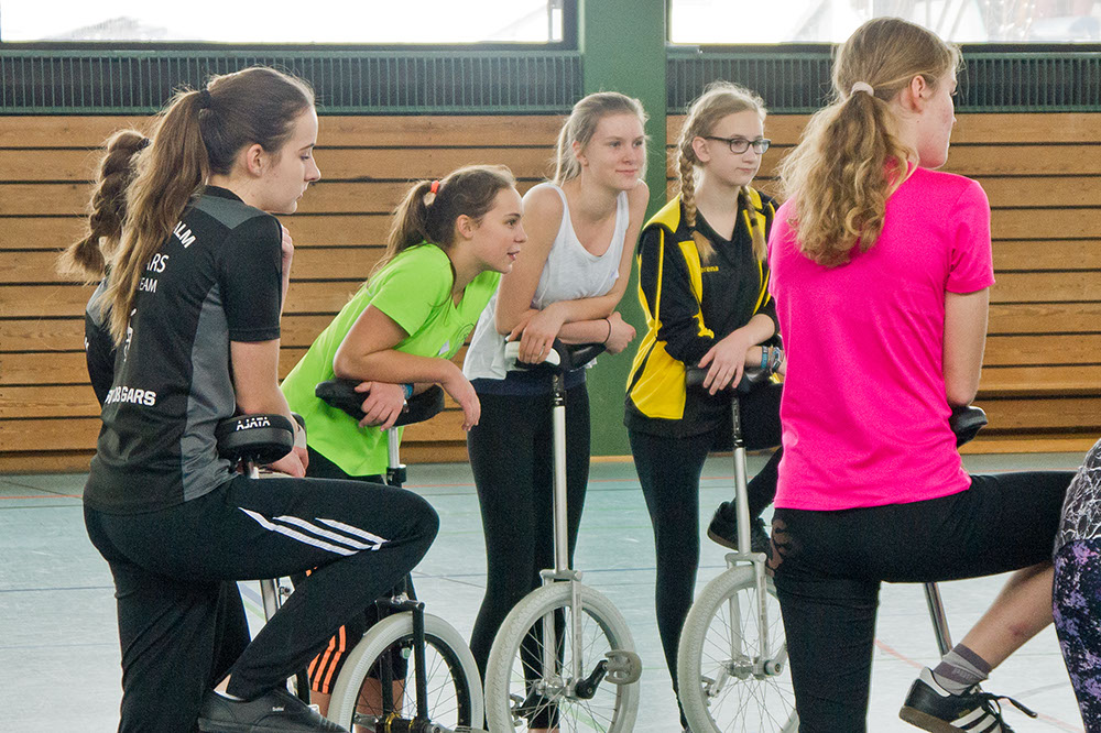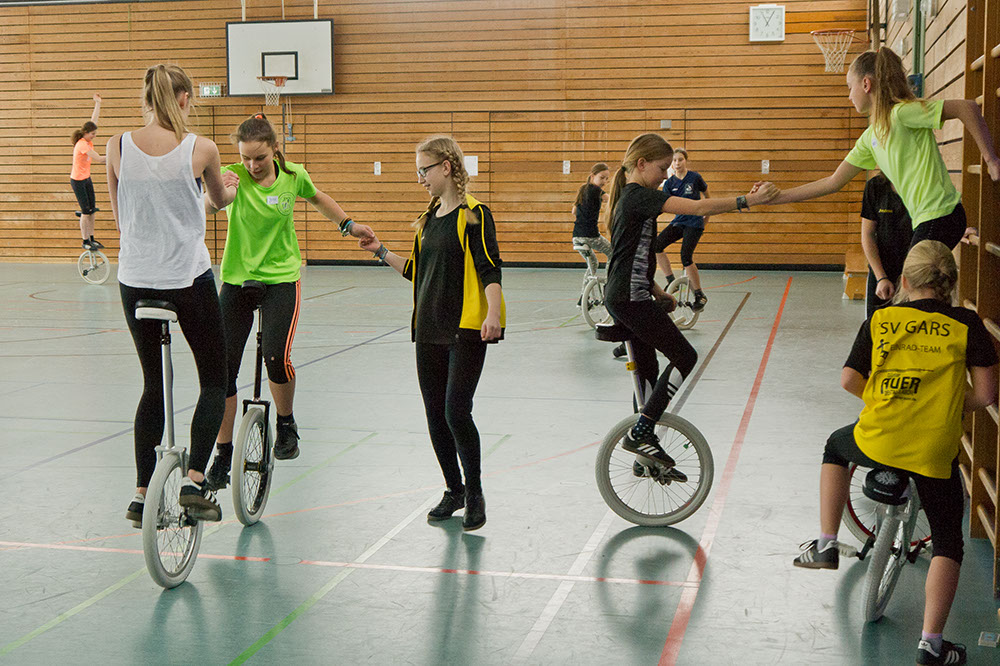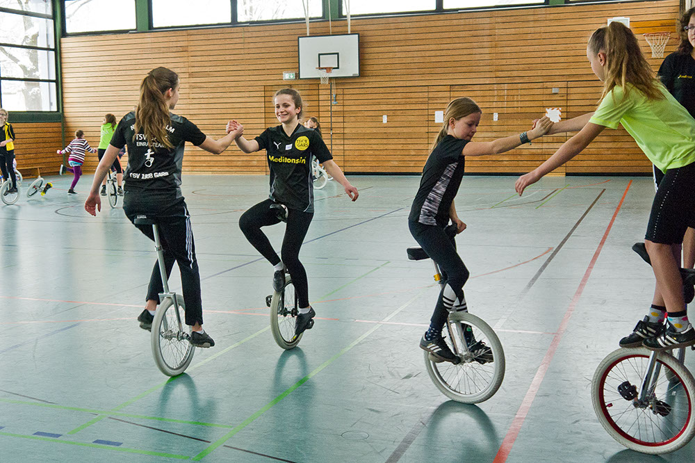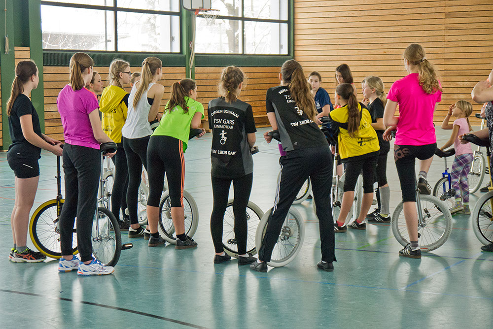 Für zwei Tage füllten am 3. und 4. Januar knapp 30 Einradler, darunter 11 Fahrerinnen des TSV Gars, die ferienverwaiste Turnhalle der Garser Mittelschule mit Energie, Spaß und guter Laune beim Tricktraining des EVB. Das wurde von der 18-jährigen Sophia Plininger geleitet, die ein abwechslungsreiches Übungsprogramm vorbereitet hatte und ambitionierte Hobbyfahrer ebenso inspirierte wie die wettkampferfahrenen Profis. Hier ein paar Fotoimpressionen: