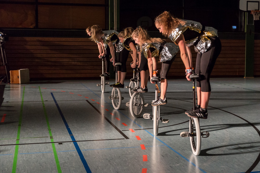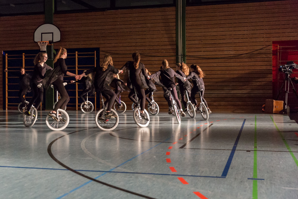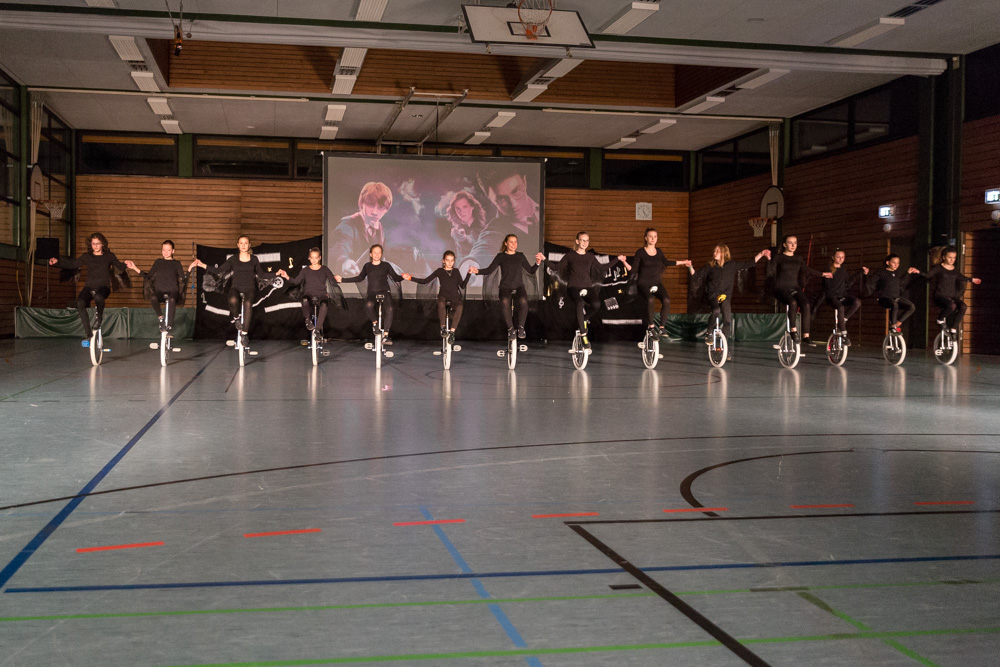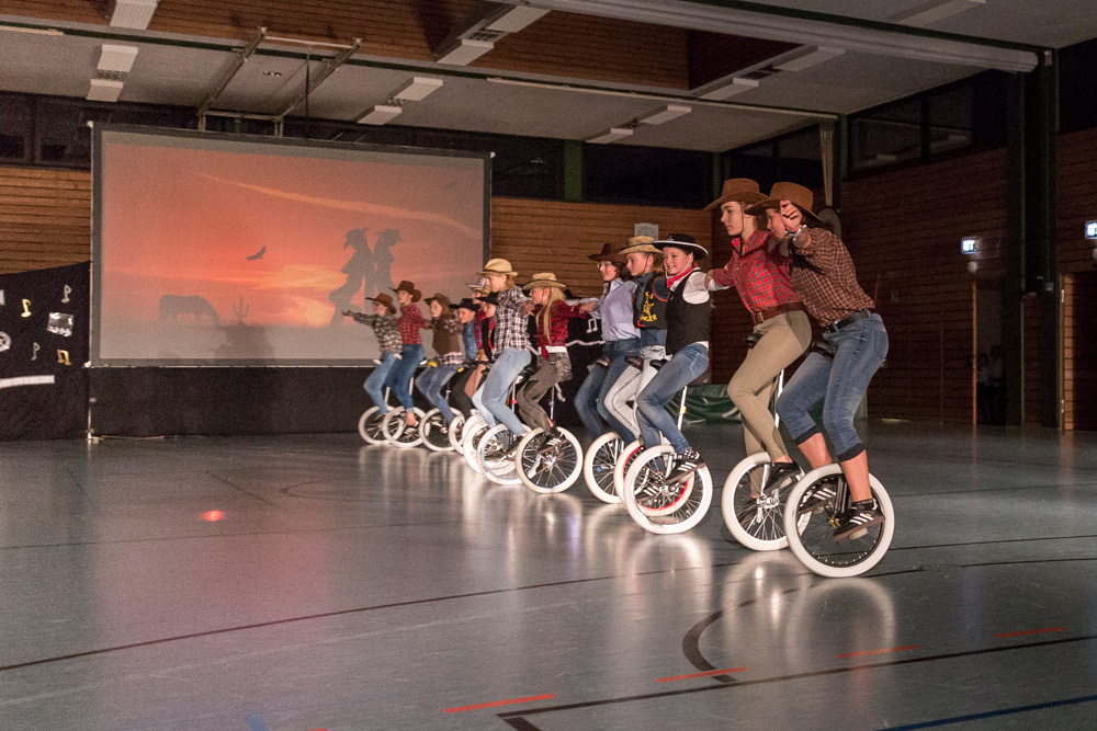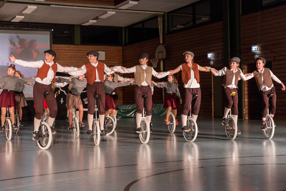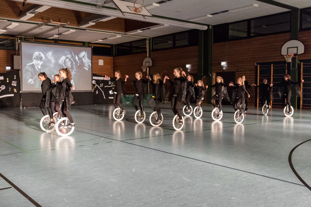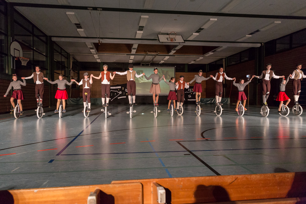Die 29 Garser Einradler (ein Mädchen musste wegen eines gleichzeitig stattfindenden Kuraufenthaltes leider passen) wuchsen über sich hinaus und verblüfften die Zuschauer, aber auch sich selbst damit, dass sie auf den Punkt genau fit waren und die einstudierten Küren mit großer Hingabe und schauspielerischem Talent sehr sicher darbieten konnten.