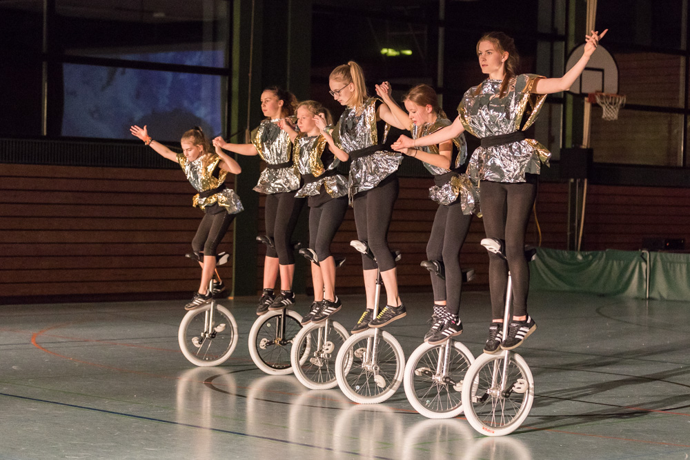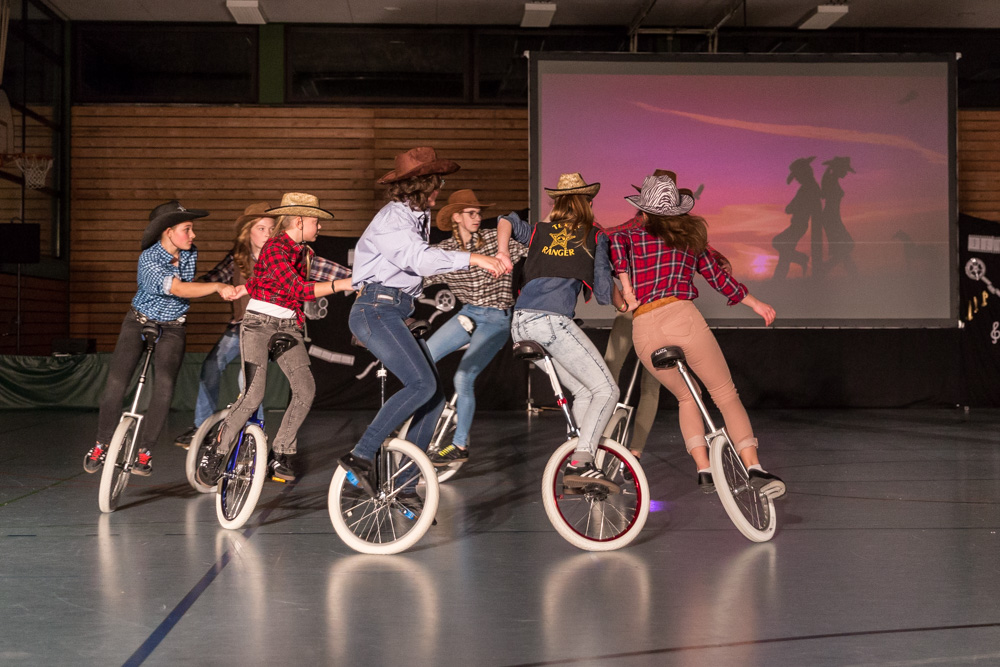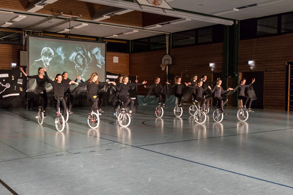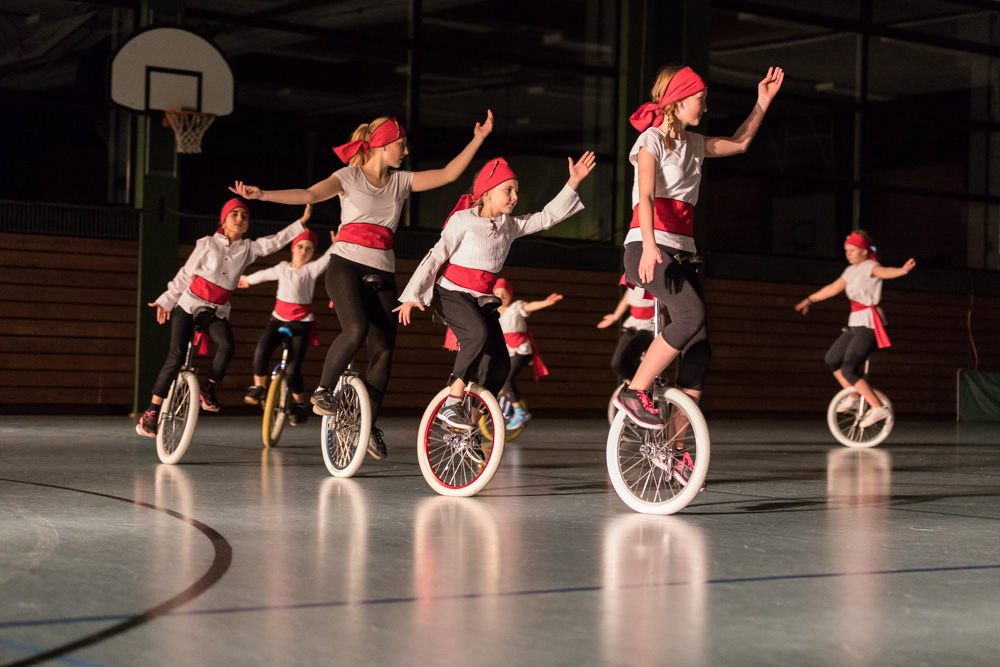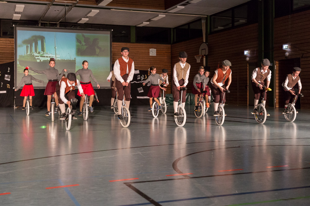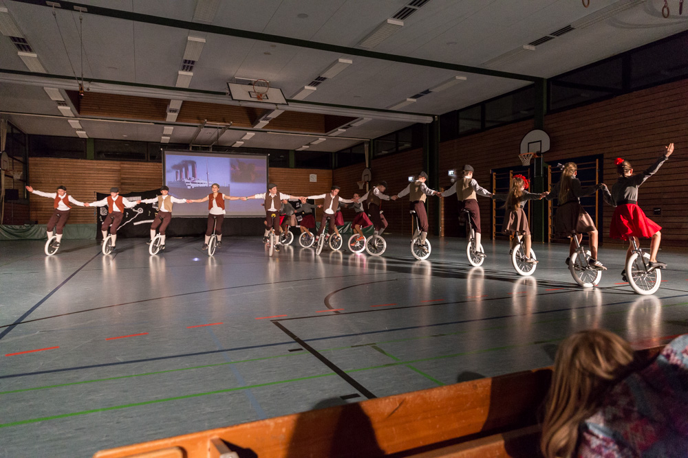 Die 29 Garser Einradler (ein Mädchen musste wegen eines gleichzeitig stattfindenden Kuraufenthaltes leider passen) wuchsen über sich hinaus und verblüfften die Zuschauer, aber auch sich selbst damit, dass sie auf den Punkt genau fit waren und die einstudierten Küren mit großer Hingabe und schauspielerischem Talent sehr sicher darbieten konnten.