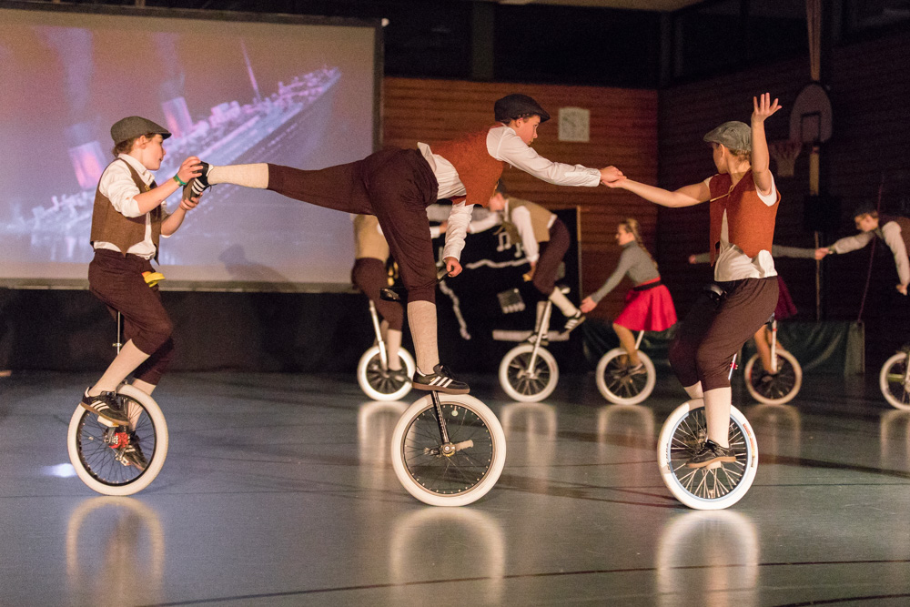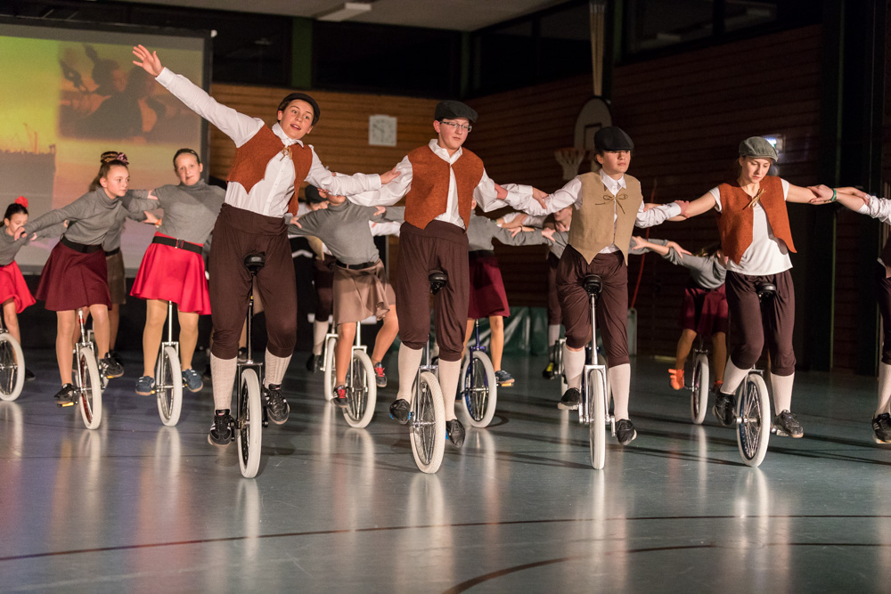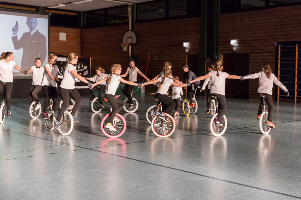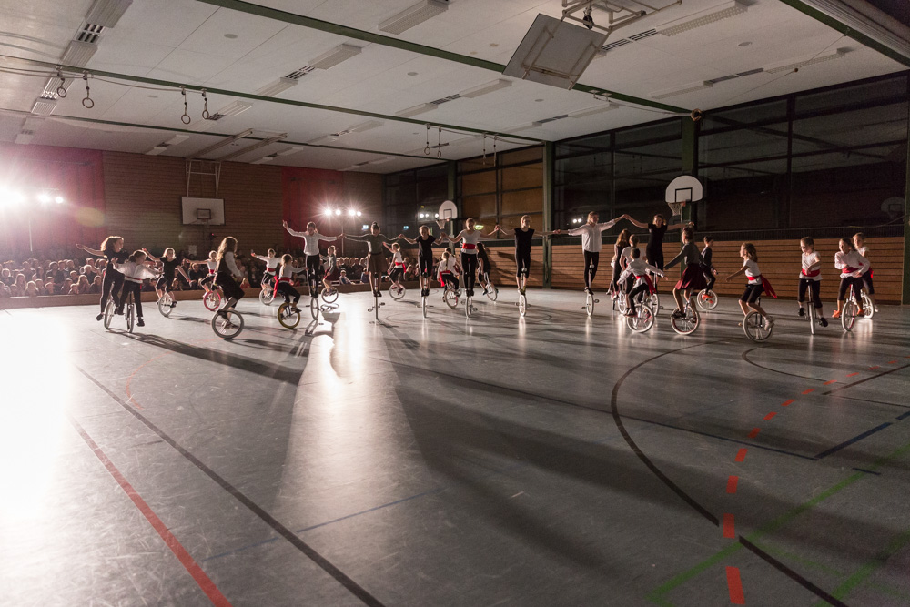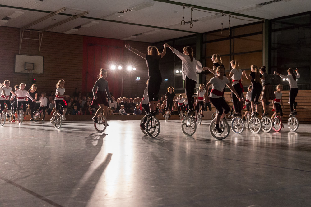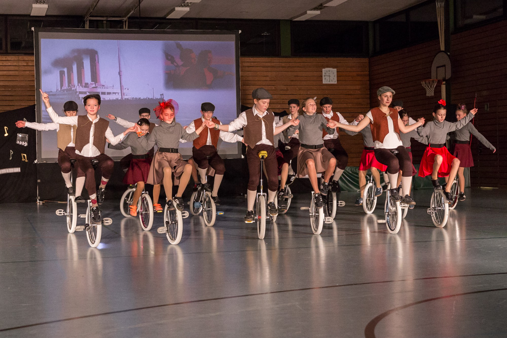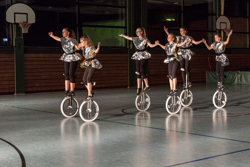Die 29 Garser Einradler (ein Mädchen musste wegen eines gleichzeitig stattfindenden Kuraufenthaltes leider passen) wuchsen über sich hinaus und verblüfften die Zuschauer, aber auch sich selbst damit, dass sie auf den Punkt genau fit waren und die einstudierten Küren mit großer Hingabe und schauspielerischem Talent sehr sicher darbieten konnten.