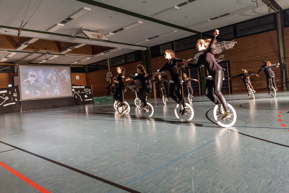 Eine Kür mit atemberaubendem Tempo zeigten 14 Fahrer der Fortgeschrittengruppe zu einem Medley aus verschiedenen Harry-Potter-Filmen. Ein Raunen ging durch die Zuschauerreihen, als das Klappmesser in großer Geschwindigkeit exakt gelang.