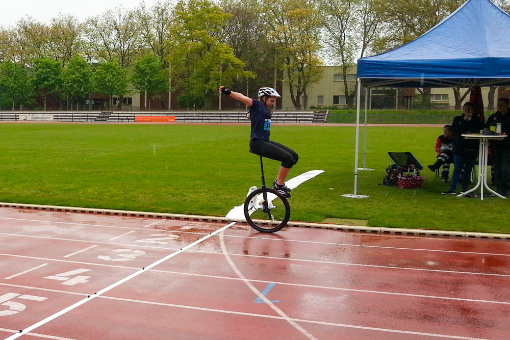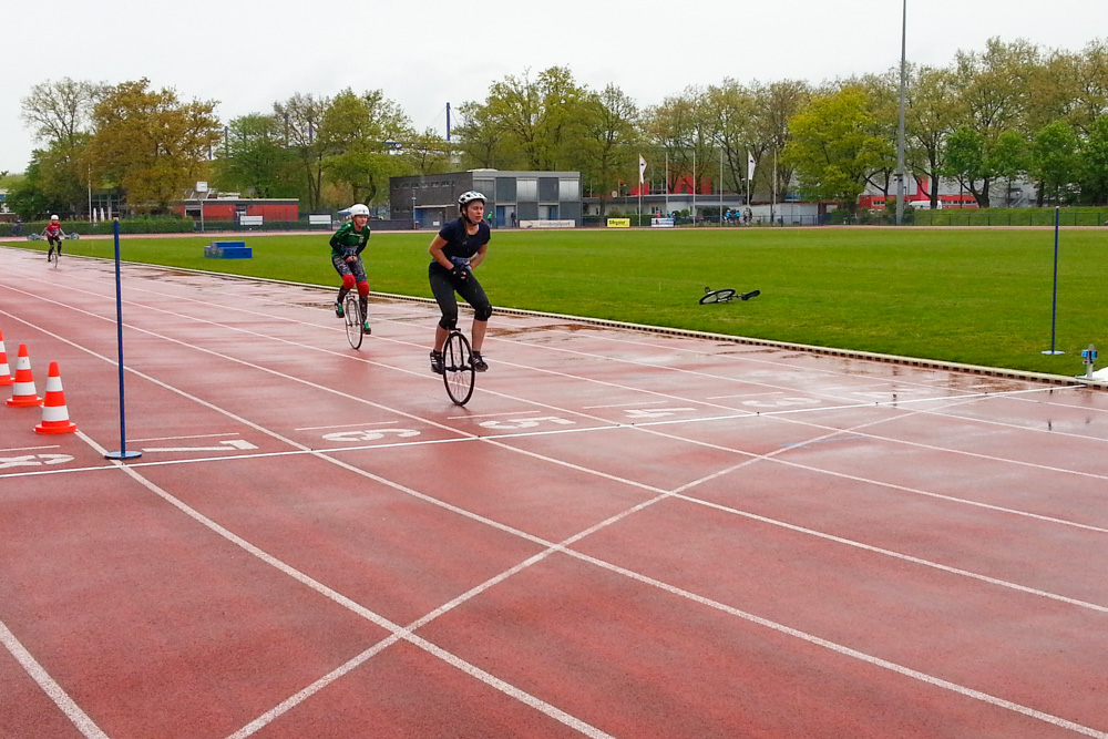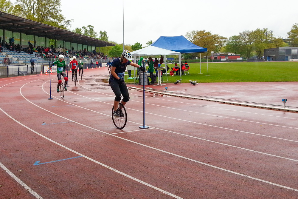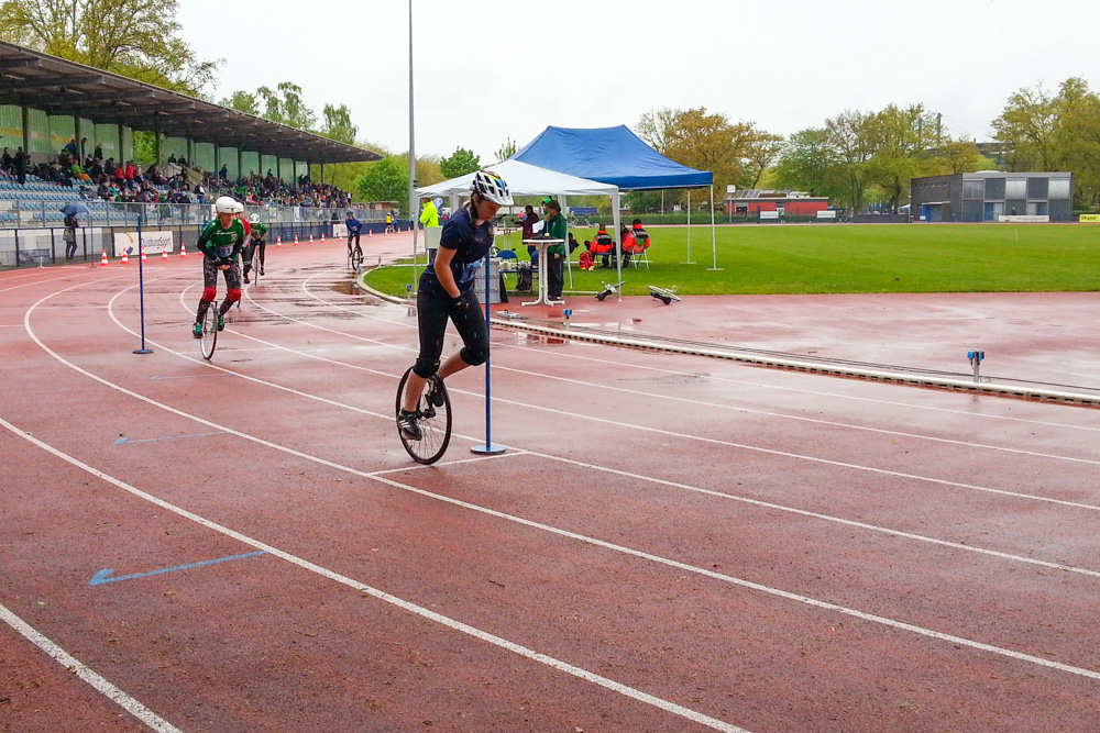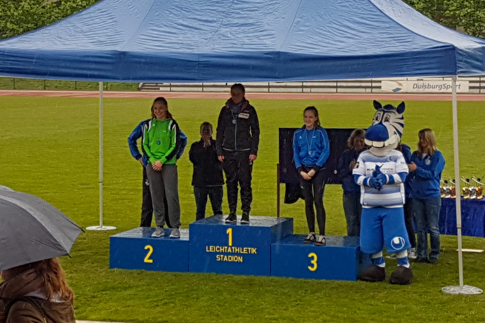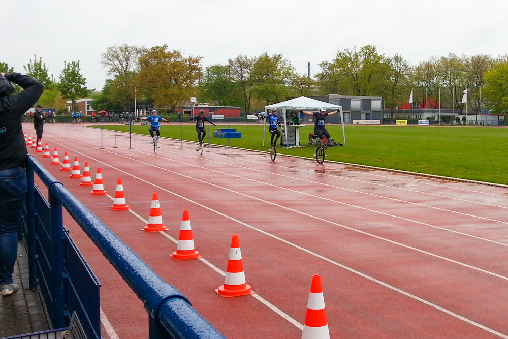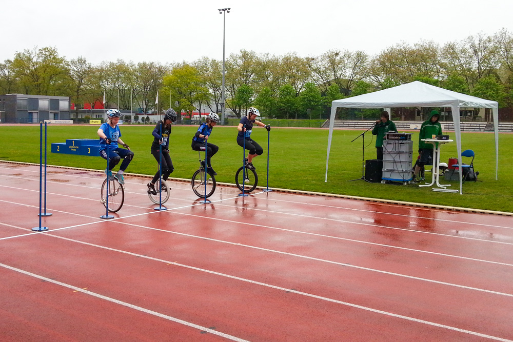 Nach zweieinhalb Tagen Turnhallenluft (bei schönstem Wetter draußen vor der Turnhallentür) wechselten wir am 1. Mai für die Rennen des Zebra-Cups unsere Position von Bottrop indoor nach Duisburg outdoor. Leider wechselte mit uns auch das Wetter von sonnig und warm nach verregnet und kalt – suboptimal für alles, was auf der Tartanbahn ablaufen soll. Aber man kann es sich nicht aussuchen, und da die Bedingungen den ganzen Tag über konstant blieben, kämpften zumindest alle 160 Teilnehmer mit den gleichen Widrigkeiten.
